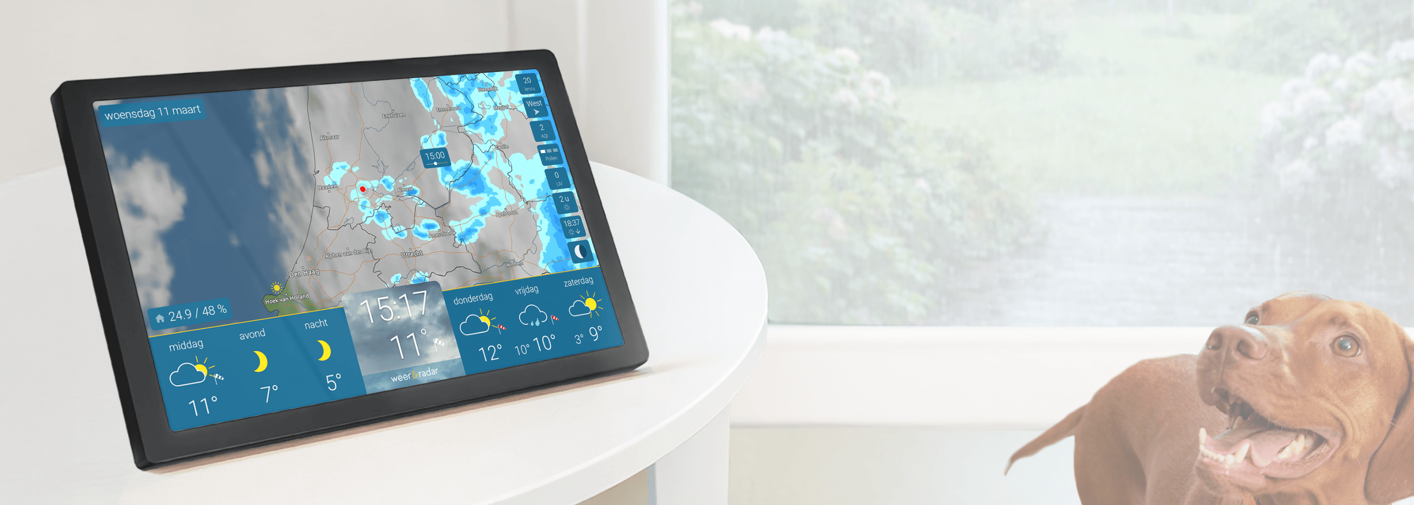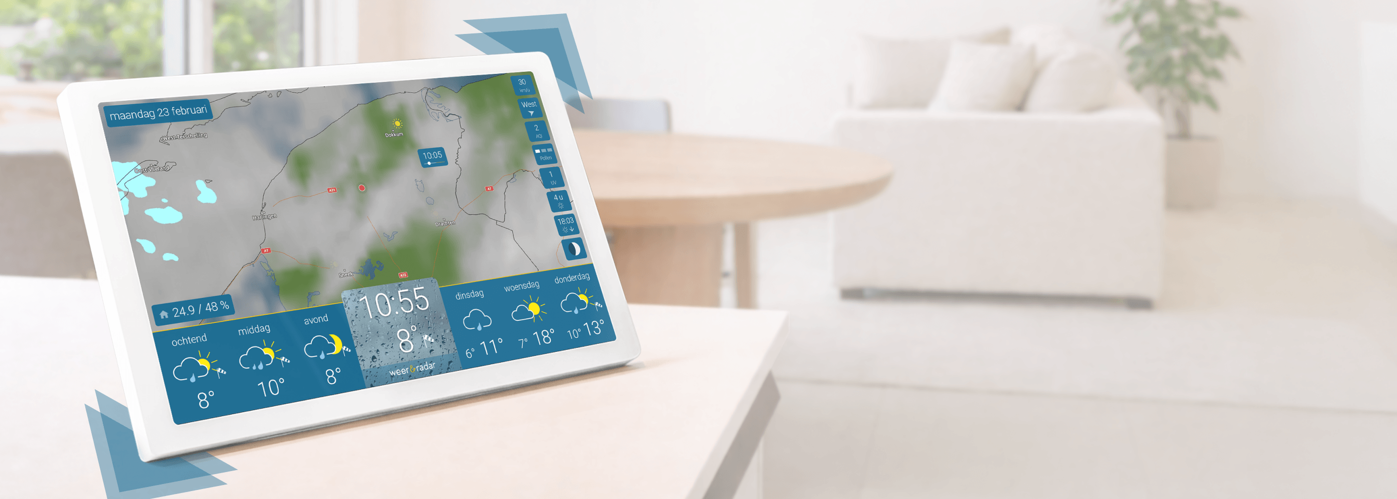 De UV-index geeft aan wanneer de zon bijzonder intens is. Handig voor gezinnen, sporters of tuinliefhebbers. Je weet meteen wanneer je zonnebrandcrème nodig hebt of wanneer je even rust in de schaduw moet nemen.