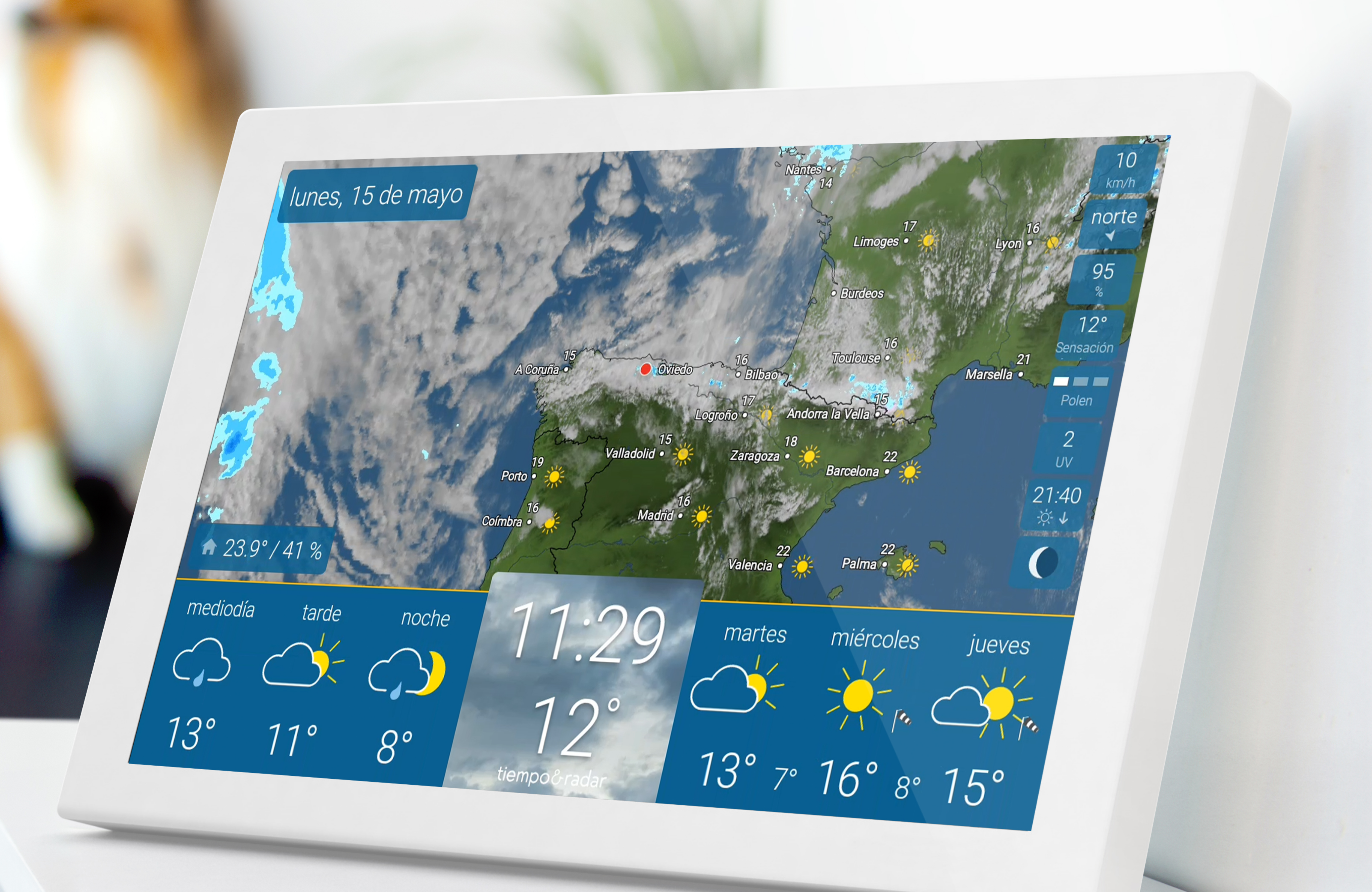 La parte inferior de la pantalla te muestra de manera clara y estructurada el tiempo diario a la izquierda y la tendencia meteorológica para los próximos días a la derecha. La hora y la temperatura actual se muestran en el centro.