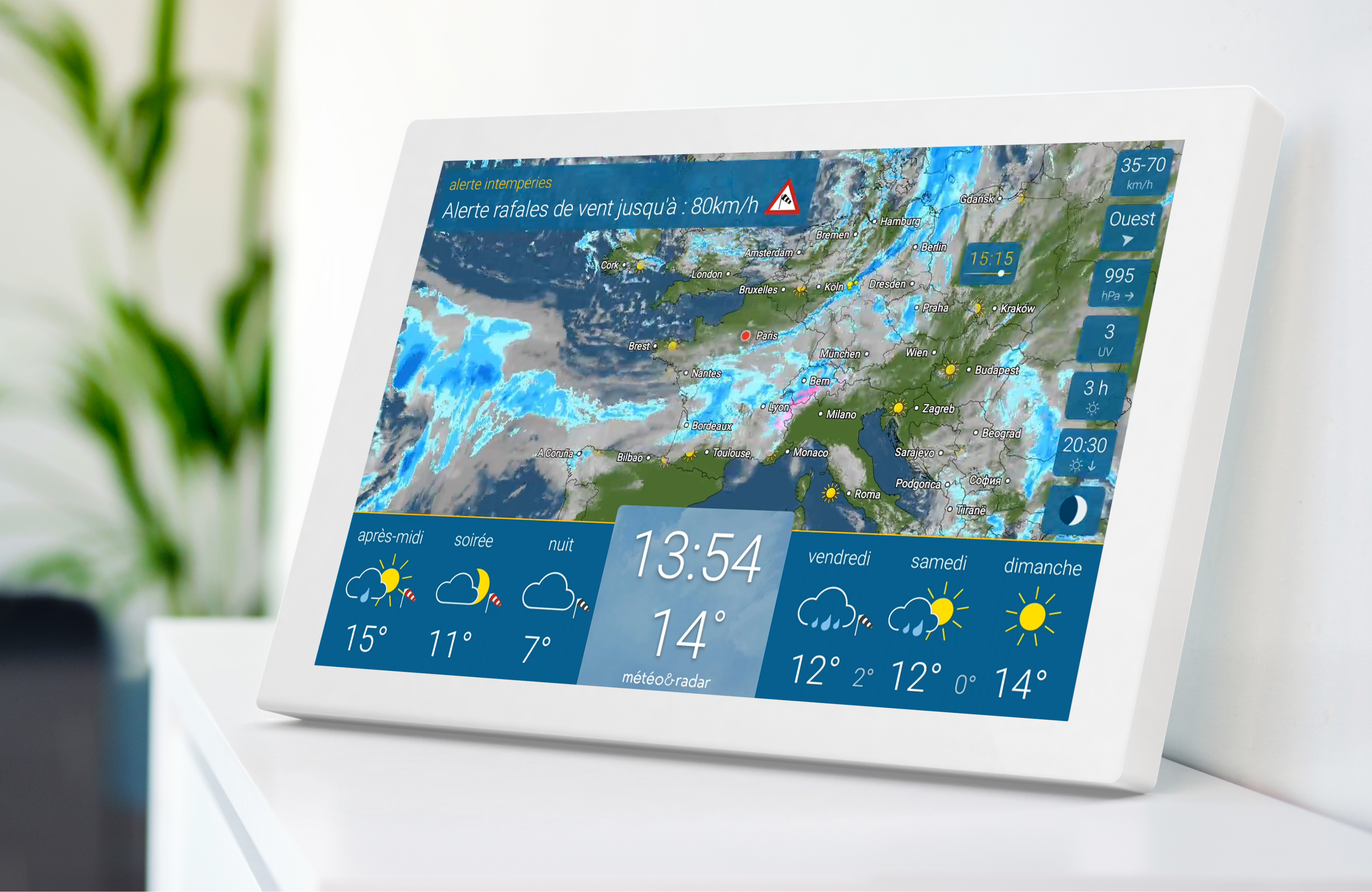 Sur un écran HD vous disposez de manière claire et précise d’informations sur la météo actuelle pour un lieu déterminé par localisation, et ce dans le monde entier. Avec le radar météo, vous pouvez suivre en direct la météo pour les 90 prochaines minutes. En effectuant un zoom avant obtenez plus de détails et avec un zoom arrière évaluez l’évolution du temps à venir. La tendance météo indique les prévisions pour aujourd'hui et les prochains jours. La station météo vous alertera également des intempéries à venir. Vous pouvez, selon vos besoins, choisir l’affichage d’informations météorologiques complémentaires.