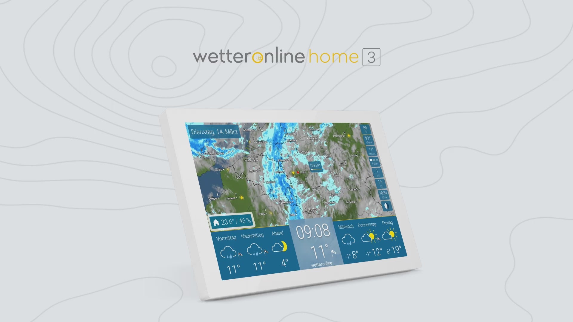 La météo & radar home est conçue pour une utilisation en continu. Les heures de fonctionnement personnalisables, la consultation rapide des données météo et l'installation de mises à jour du logiciel rendent la station météo WiFi particulièrement facile à utiliser. Les prévisions météo les plus récentes sont toujours visibles au premier coup d’œil et vous aident à planifier votre journée.
