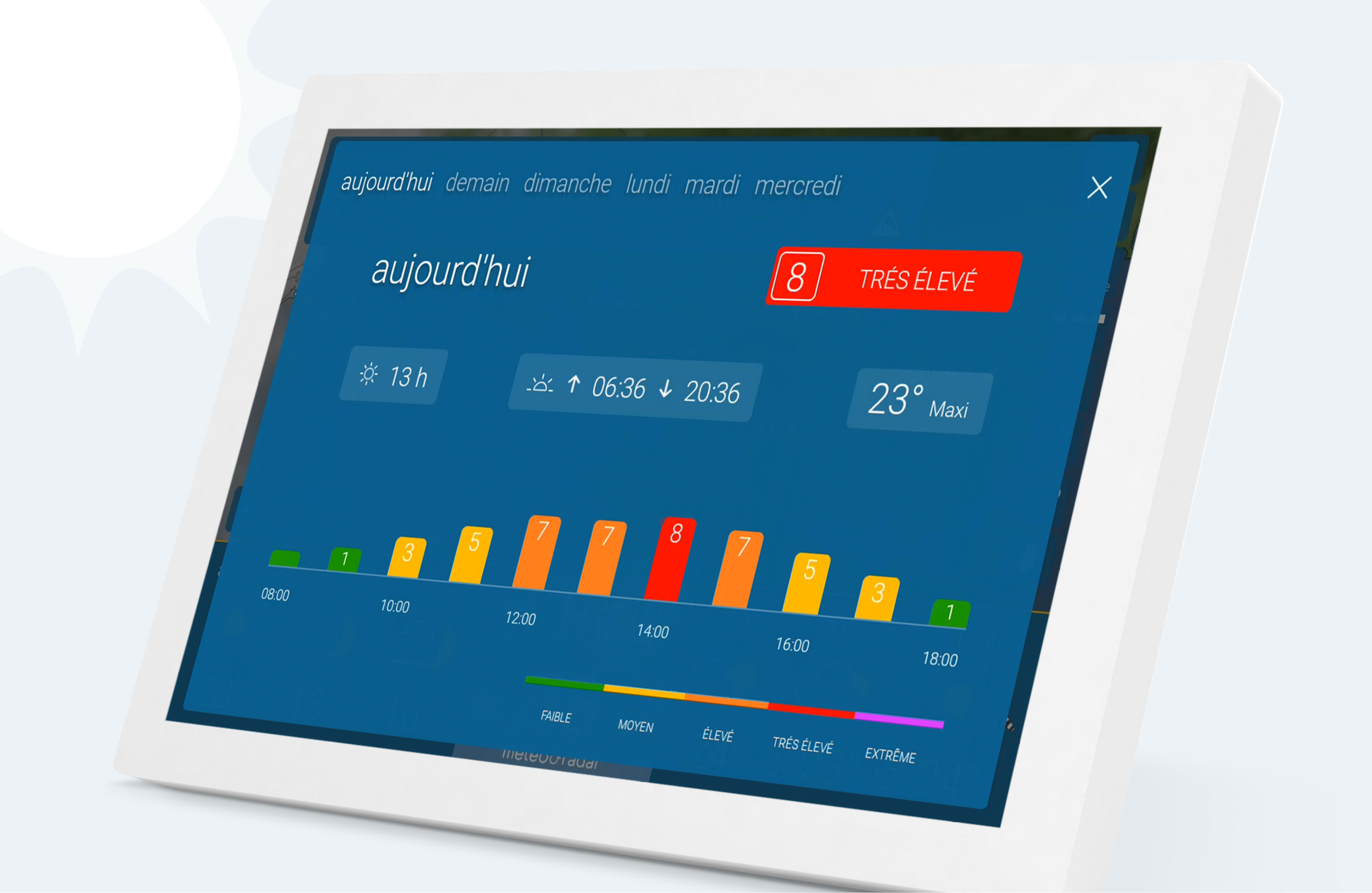 Le nouveau capteur d’intérieur contribue à un climat ambiant agréable dans votre maison. Les informations sur la température et l'humidité de l'air peuvent par exemple aider à chauffer et à aérer efficacement. Pour les personnes allergiques, des informations encore plus détaillées sur les concentrations de pollen ainsi qu'un calendrier pollinique sont désormais disponibles. Ces informations facilitent la planification à court et à long terme. L'indice UV est affiché non seulement pour la journée en cours, mais aussi pour les six jours à venir. Les niveaux vont de "faible" à "extrême" et donnent une indication sur les mesures à prendre pour se protéger des rayons UV nocifs.