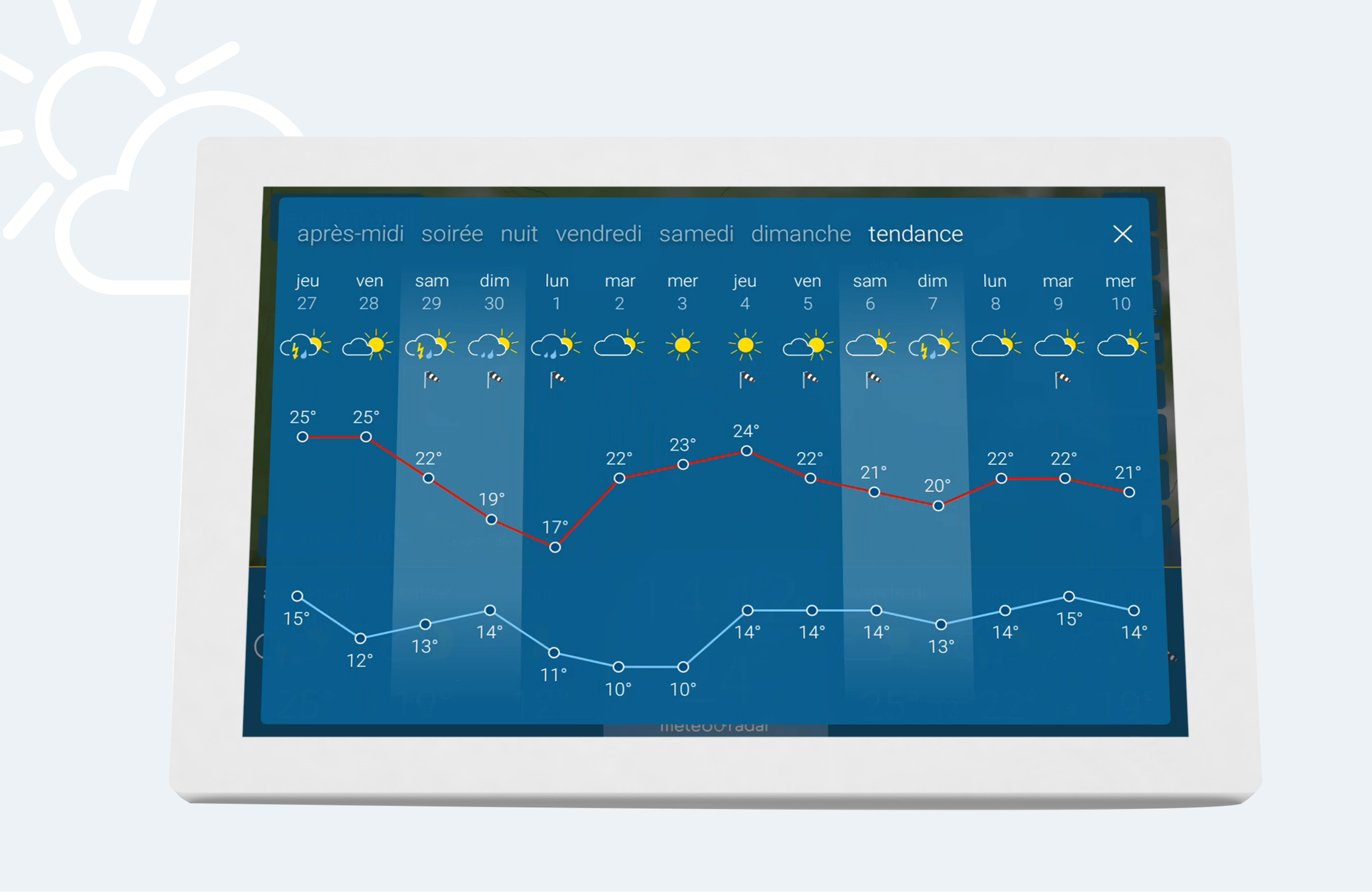 Cliquez sur l'option de menu "tendance" dans la vue par intervalles du jour de prévision, vous verrez la tendance météo des 14 prochains jours avec l'évolution des températures.